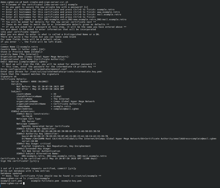 Terminal output of the Root CA Certificate creation script showing the domain example.retro receiving a certificate